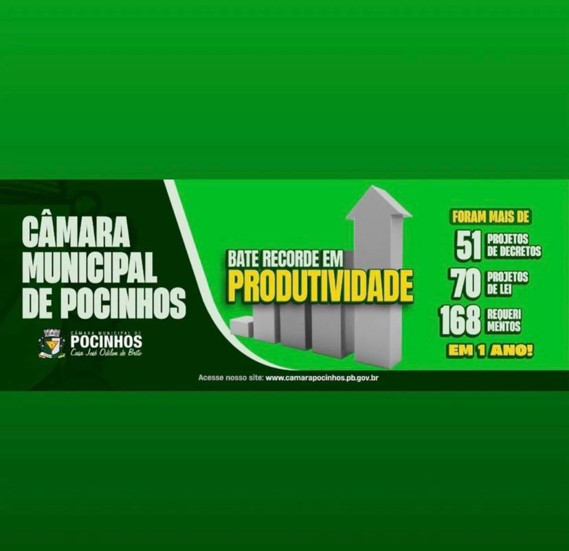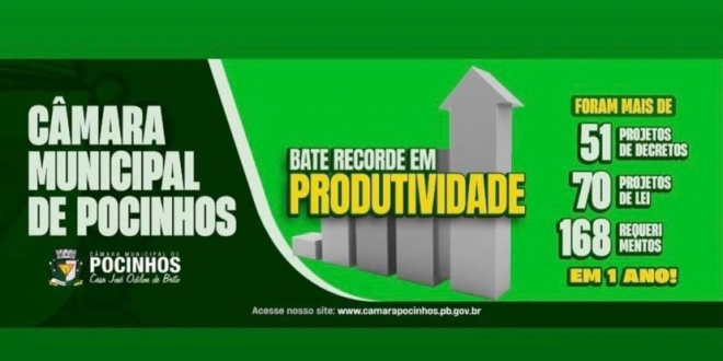 A Câmara Municipal de Pocinhos bate recorde em produtividade referente aos projetos do ano de 2023. Foi um ano de conquistas e realizações, mas, principalmente de produtividade. Foram mais de 51 projetos de decretos, 70 projetos de lei e 168 requerimentos, tudo isso em um ano de muito trabalho e bons frutos colhidos.