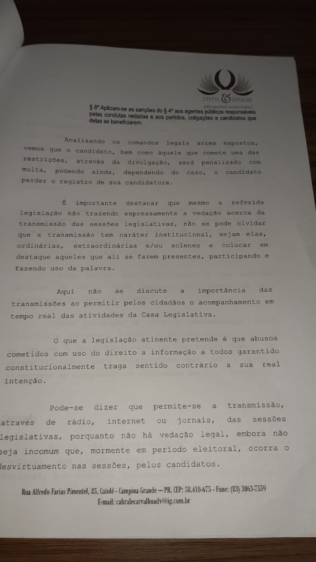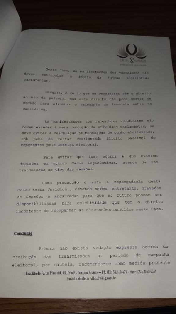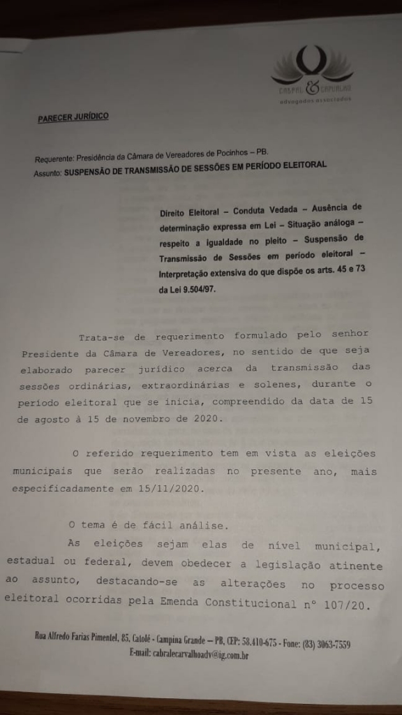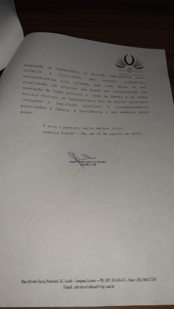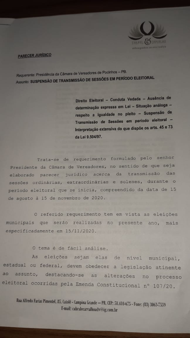 A Casa José Odilon de Brito, seguindo as recomendações do Parecer Jurídico emitido pelo corpo jurídico da mesma, resolve suspender todas as transmissões de todas as Sessões Ordinárias, Extraordinárias e Especiais, durante o período eleitoral, que se inicia em 15 de Agosto de 2020 e vai até o dia 15 de Novembro de 2020.